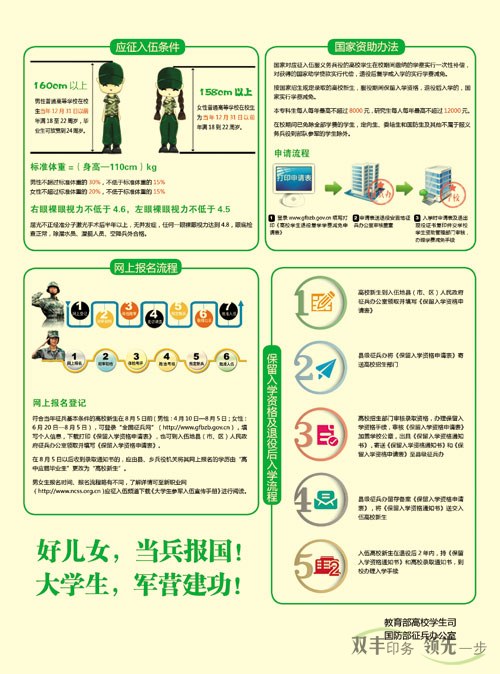 《中華人民共和國憲法》規(guī)定:“依照法律服兵役和參加民兵組織是中華人民共和國公民的光榮義務(wù)”。部隊是青年學(xué)生成長成才的大學(xué)校,是砥礪品格、增強意志的好課堂,是施展才華、成就事業(yè)的大舞臺。國防和軍隊現(xiàn)代化建設(shè),迫切需要一大批有責(zé)任、敢擔(dān)當?shù)挠兄厩嗄陻y筆從戎、報效祖國。為鼓勵大學(xué)生應(yīng)征入伍,國家出臺了一系列優(yōu)惠政策,現(xiàn)寄上,供參考。