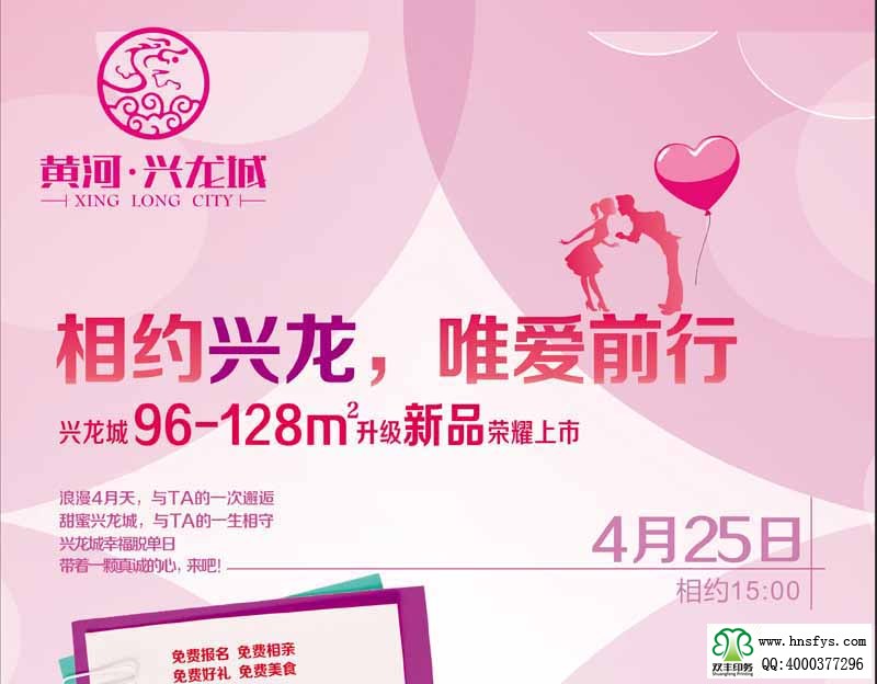 雙豐彩?。狐S河興龍城 宣傳DM單 成品尺寸:寬28.5CM 高42CM 200克銅版紙 內(nèi)容提要:浪漫4月天,與TA的一次邂逅 甜蜜興龍城,與TA的一生相守 興龍城幸福脫單日 帶著一顆真誠的心,來吧 新核/影響城市發(fā)展未來 焦點/一站式生活地標區(qū) 璀璨/核心商業(yè)閃耀全城 實力/十年沉淀厚積薄發(fā)